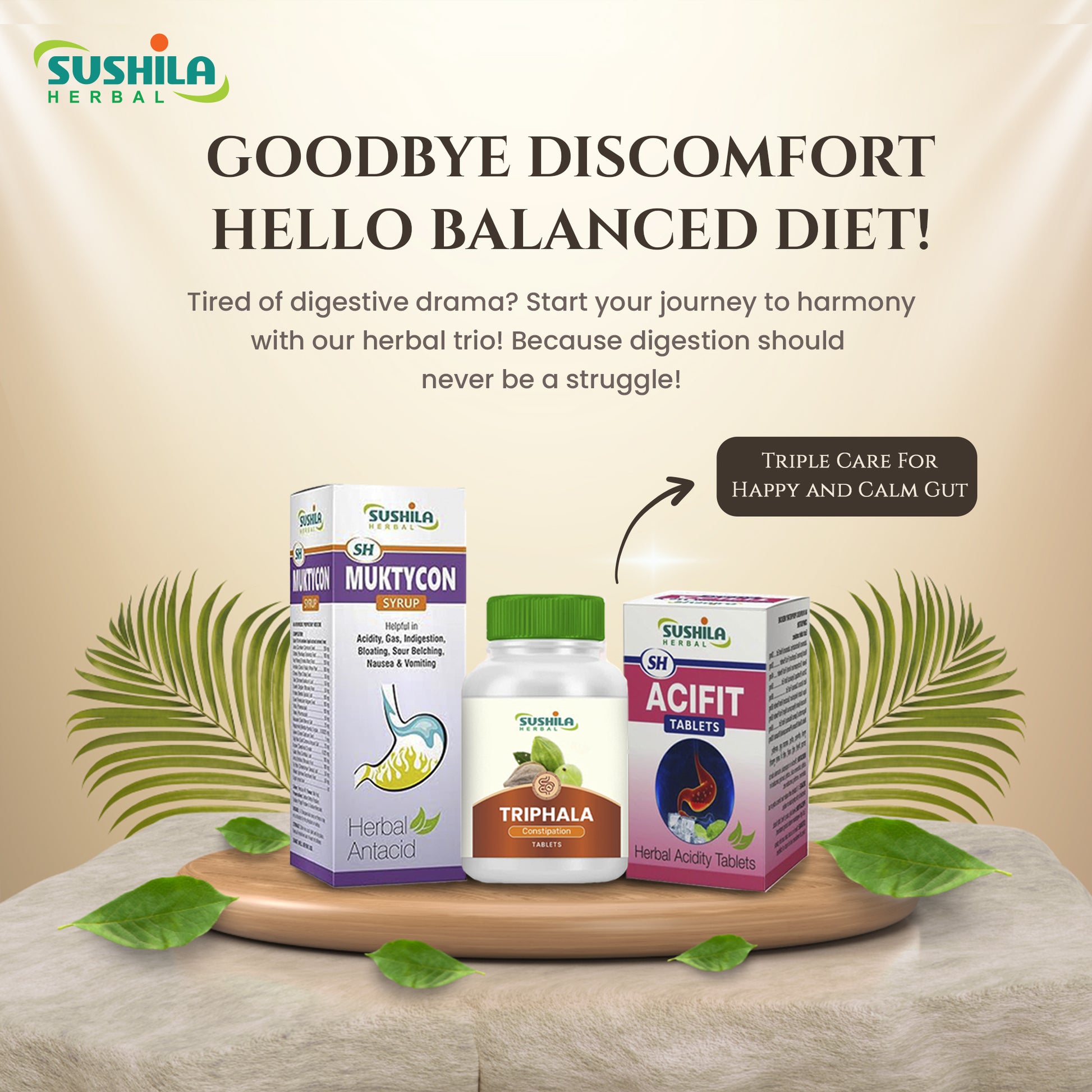 Combat acidity and indigestion with the Anti-Acidity Care Combo. Includes Myktycon Syrup, Acifit Tablets, and Triphala Tablets to balance acidity levels, aid digestion, and support gut health.