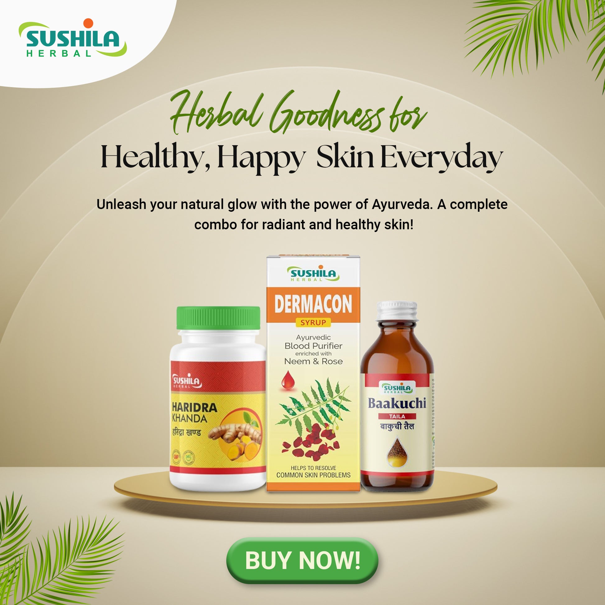 Achieve clear, radiant skin with the Skin Care Combo. Featuring Dermacon Syrup, Neem Tablets, Haridrakhand, and Bakuchi Oil, this combo helps detoxify, purify, and nourish your skin from within.