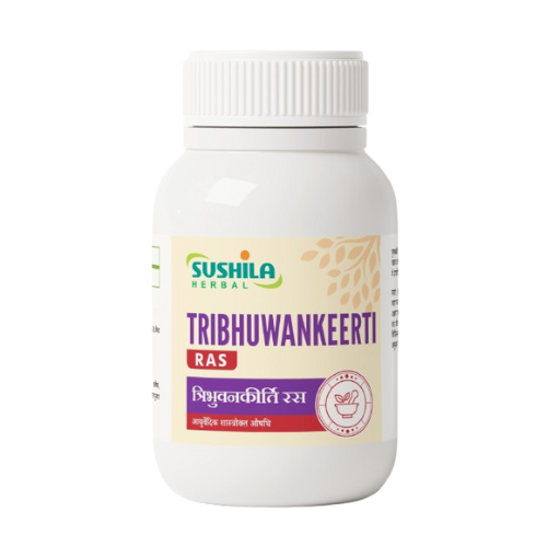 Tribhuvankeerti Ras is a classical Ayurvedic formulation used to treat fever, cold, cough, and flu-like symptoms. It helps reduce body temperature, clears respiratory congestion, and boosts immunity. Enriched with ingredients like Trikatu and Godanti Bhasma, it balances Vata and Kapha doshas. Effective in acute respiratory infections. Use only under medical supervision.